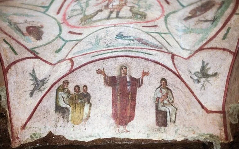 Art: A priest holds her hands in the orans position, Catacombs of Priscilla, Rome.